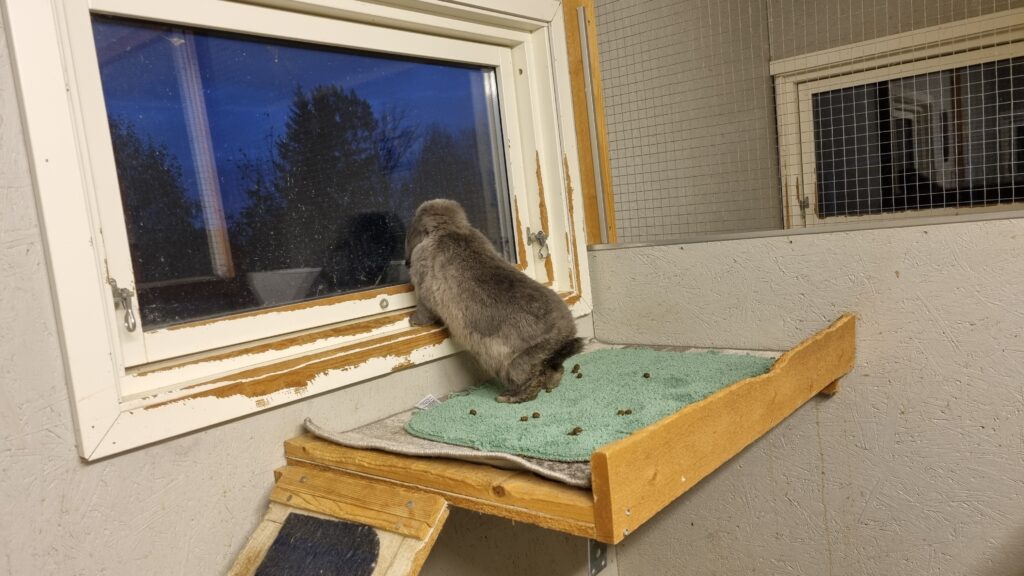 Det er nemlig viktig for oss å være ærlige: Snickers er i dag meget territoriell. Han er stort sett renslig, men kan markere noe hvis han får nye naboer/feriegjester hos fosterhjemmet han bor i nå. Av den grunn bør han bo ute og i et miljø hvor han kan få sitt eget område uten for mye forstyrrelser, og helst med en venninne så klart. Snickers bor ute i dag og stortrives med å sitte inne på den tørre hemsen sin og titte ut av vinduet.