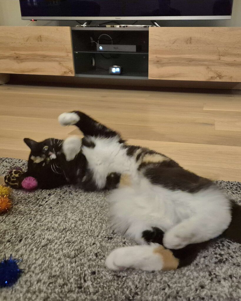 Yndlingshobbyen min er å se på katte-tv. Mus er den store favoritten. Jeg er så heldig å ha fått min helt egen 42-tommer skjerm i fosterhjemmet, og her ser jeg masse artig. Når jeg innser at musene på skjermen ikke lar seg fange, ber jeg pent om at du leker med meg, og da får jeg en ungkatts energi og jakter skikkelig. Jeg leker gjerne også med baller, men helst på egenhånd.