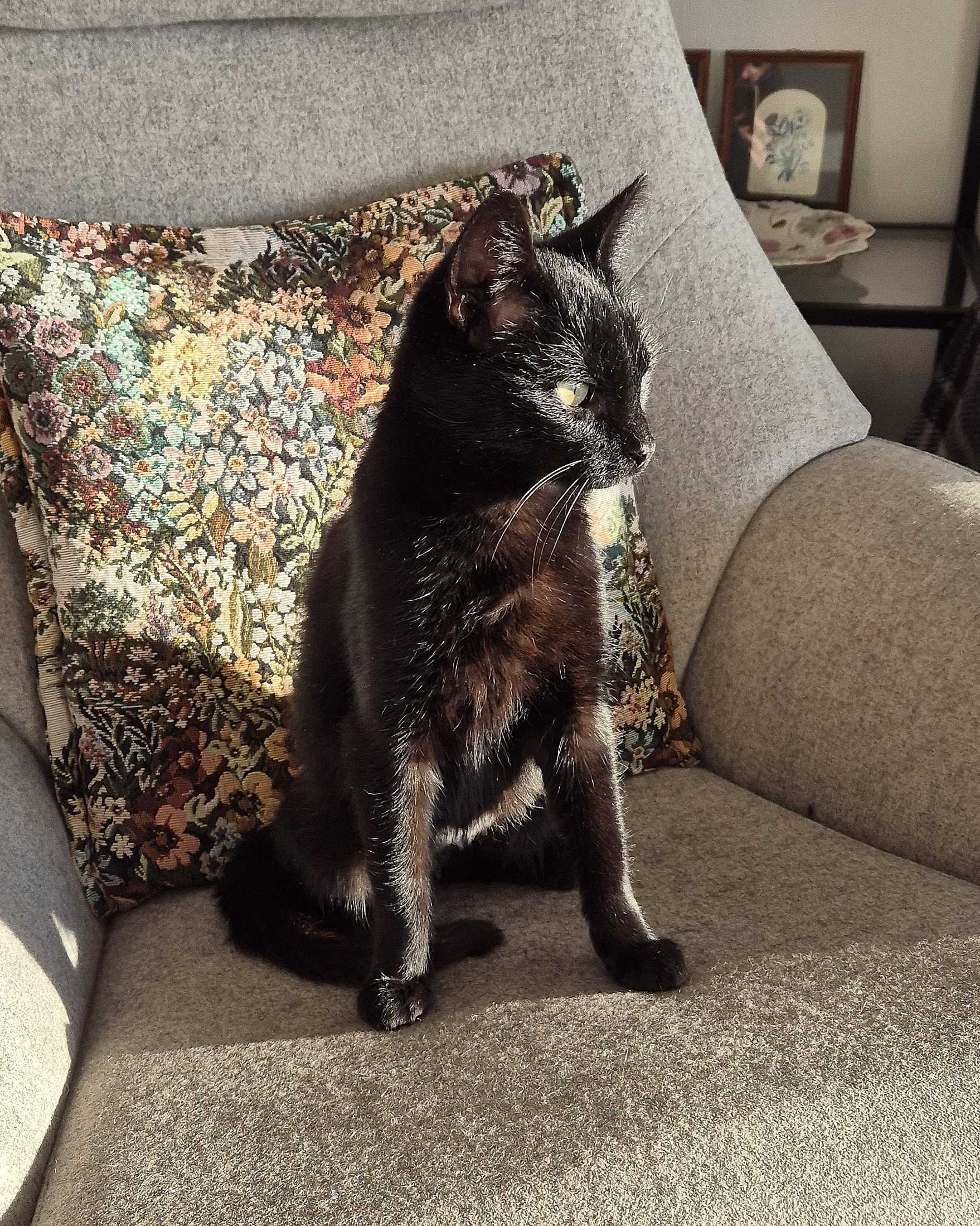 Jeg er en forsiktig kosejente som nå er på jakt etter mitt for-alltid-hjem. Jeg er en nydelig hunnkatt som elsker å stryke meg rundt beina dine, og å være tett på menneskene mine. Jeg følger deg gjerne rundt i hjemmet og har et rikt verbalt språk og lager mange ulike, sjarmerende lyder for å uttrykke meg. Jeg er både trygg og litt forsiktig av natur og trenger derfor litt tid og forutsigbarhet for å føle meg helt komfortabel.
